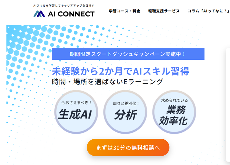 AIスキルを身につけてキャリアの可能性を広げたい方は、まずは30分の無料相談から始めてみてはいかがでしょうか。